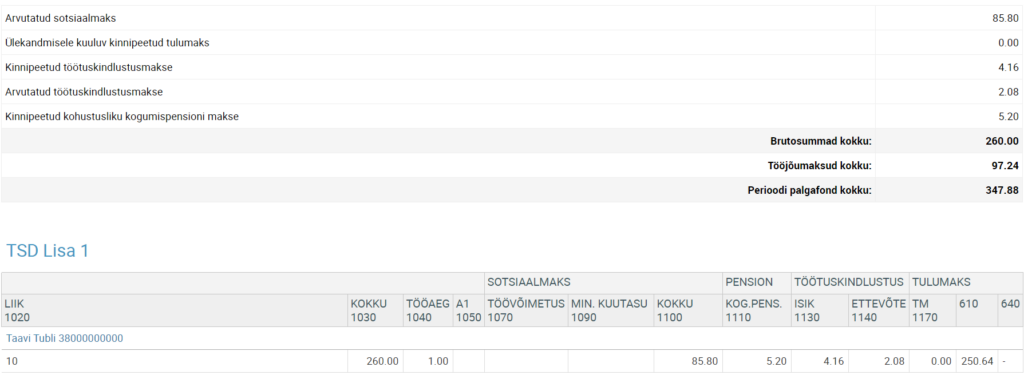 TSD-l on näha kõikide töötajate arvestuses koondmaksusummad nende tasude pealt, mis kuuluvad deklareerimisele tööandja poolt. Meie näite põhjal on tööandja palgafond kokku 347.88 ning sellest moodustavad: