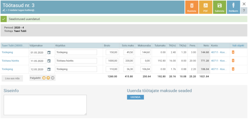 - Hind: töötasu hüvitiselt arvestatatud maksukohustuste ning kinnipidamiste summa kokku;