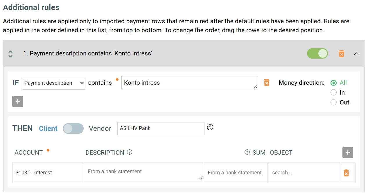 - An interest income rule can be created, for example, using Payment description contains condition. If a company uses multiple banks and wants to match interest received from each bank to a specific bank, or for example to different accounts, a separate rule must be created for each bank. In that case, the payment description value should be defined as precisely as possible so that it is unique across all rules.