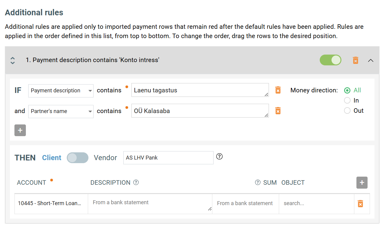 If multiple conditions have been added, all of them must be met for the rule to apply. In our example, two IF conditions have been added – Payment description and Partner’s name – so both must match for the rule to apply.