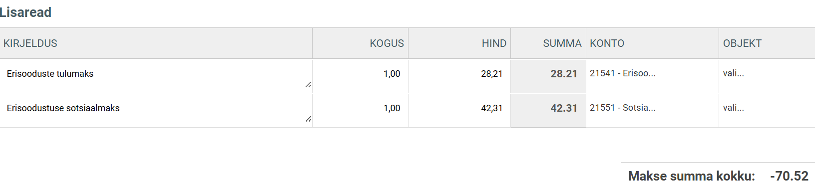 Järgmise tegevusena arvutame maksud erisoodustuselt.