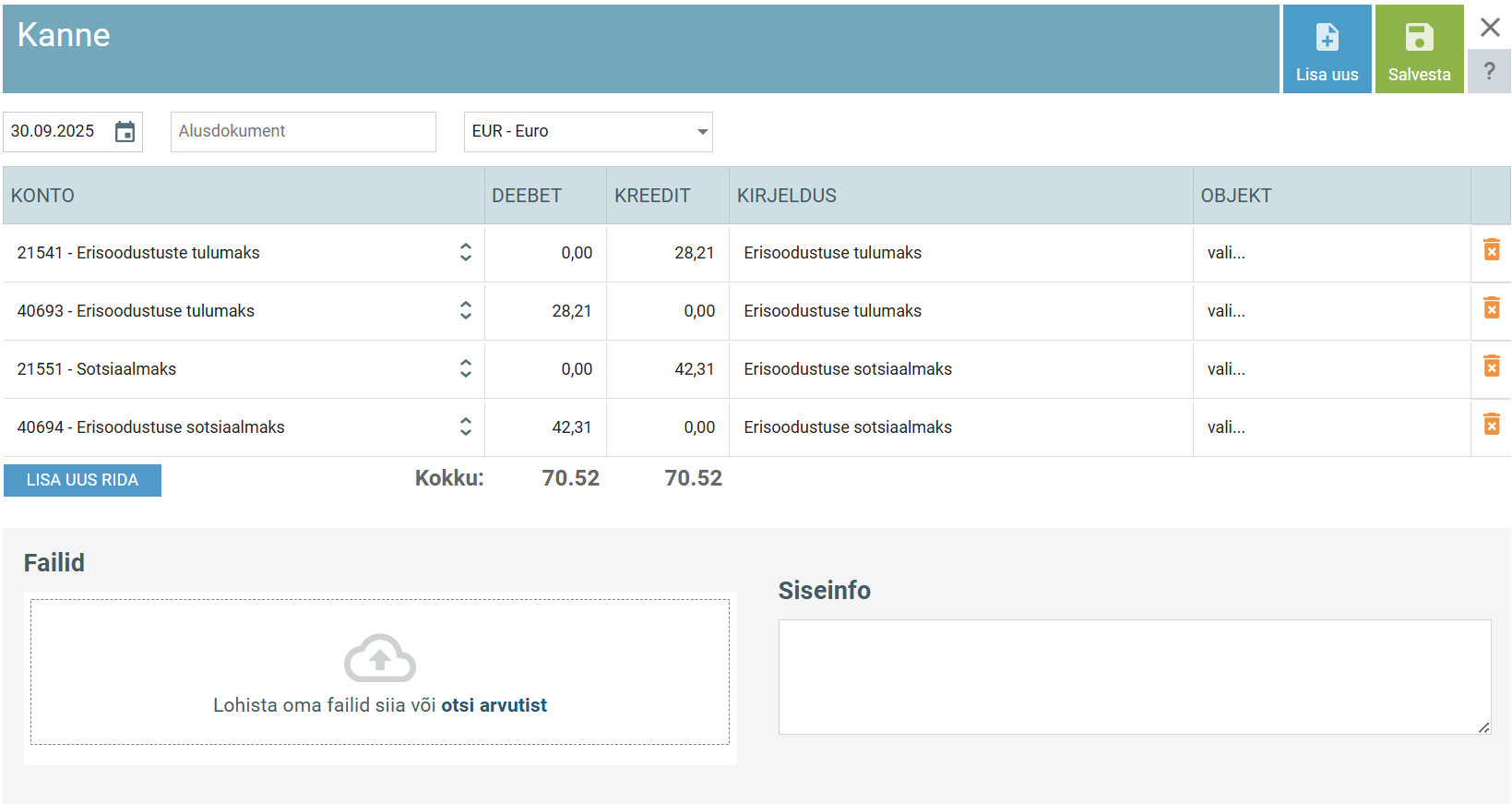 Kuna erisoodustusega seotud kuludelt tuleb arvestada tulumaks ning sotsiaalmaks, lisame järgnevalt kontoplaani ka vastavad kulukontod