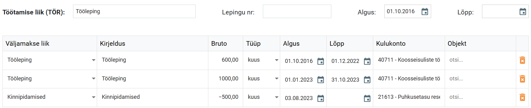 Kui tegu on regulaarse kinnipidamisega mitme kuu vältel, siis võiks kinnipidamise lisada töötajakaardile. Selleks tuleb avada töötajakaart ning lisada selle kohta eraldi rida lepingute jaotisesse. Perioodiks tuleb märkida see ajavahemik, mil kinnipidamisi tehakse.