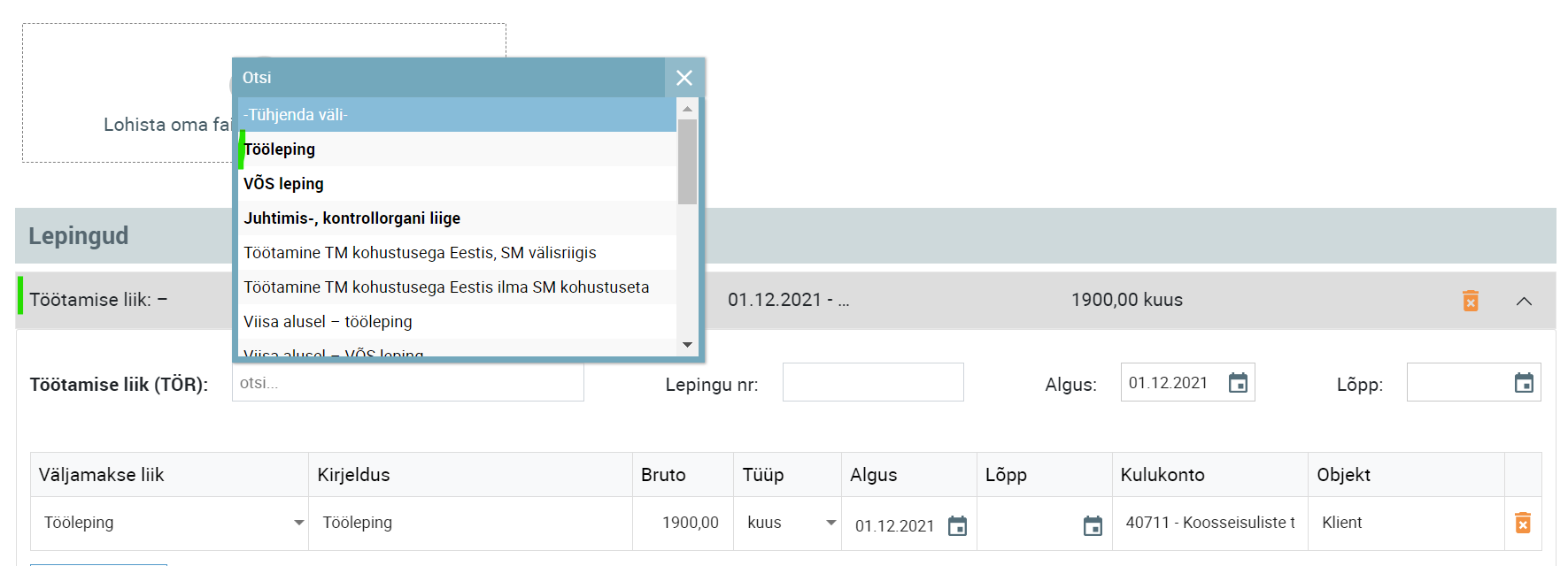 Lepingute alla lisatud objektid kantakse automaatselt ka palgalehtedele.