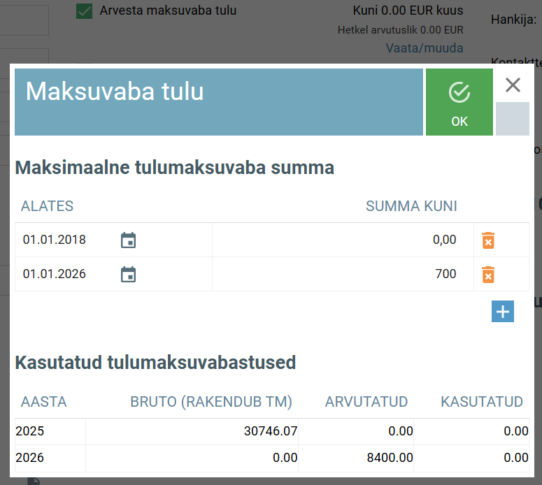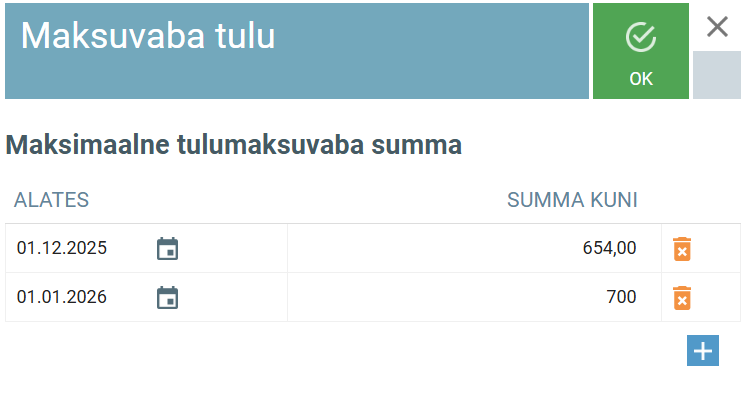 - Sisestada uus maksuvaba tulu rida alates 01.01.2026 summas kuni 700 eurot.