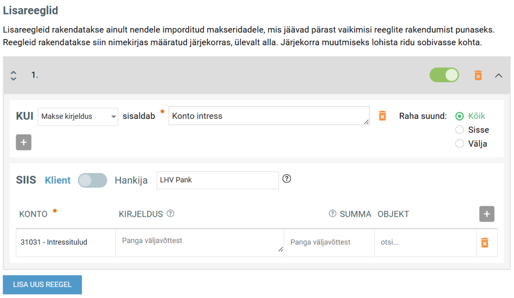 - Kui intressid laekuvad erinevatest pankadest, tuleb teha iga panga jaoks eraldi reegel just konkreetse panga intresside laekumise kirjeldusega.