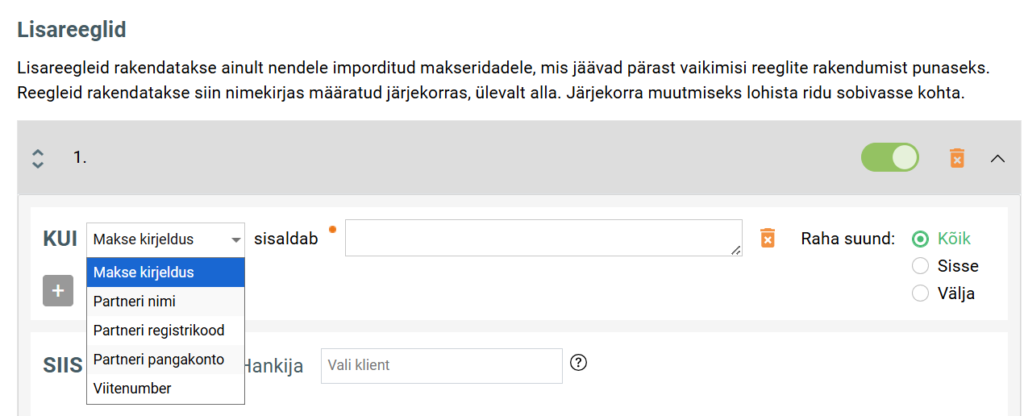 - KUI tingimuse osas tuleb seadistada see, milliseid andmeid pangamaksete impordi realt otsitakse ning