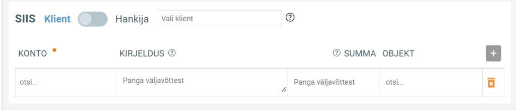 - NB! Kui pank määratakse hankijaks, siis luuakse makse vastupidise märgiga ning rida tuleb korrigeerida käsitsi.