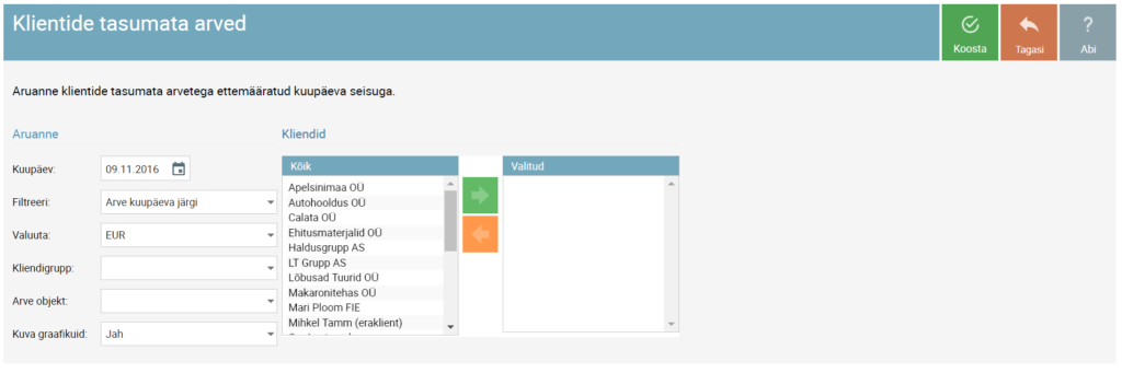 Kliendid. Saad valida, milliste klientide kohta aruannet koostada. Kui pole ühtegi klienti valitud, koostatakse aruanne üle kõikide klientide.