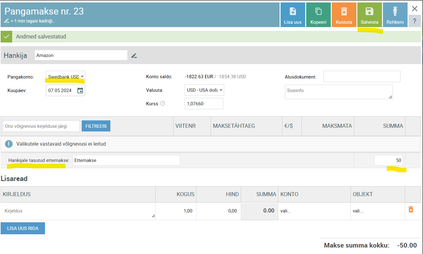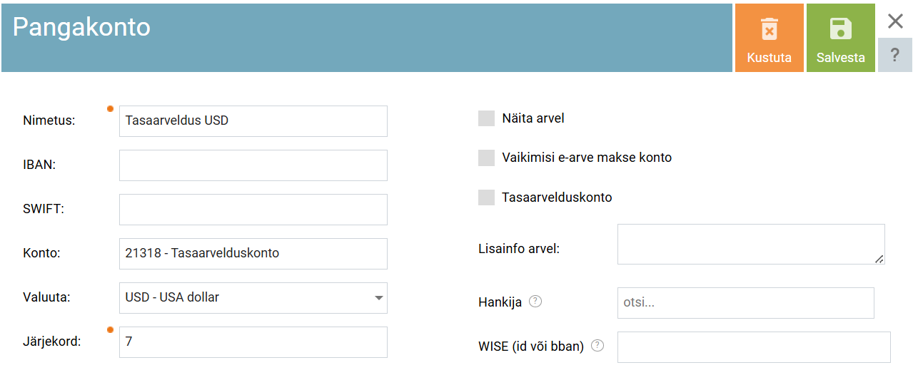 2. USD pangakonto sisestatakse pangakontode nimekirja eurodes ning märgitakse arve tasutuks EUR kontolt