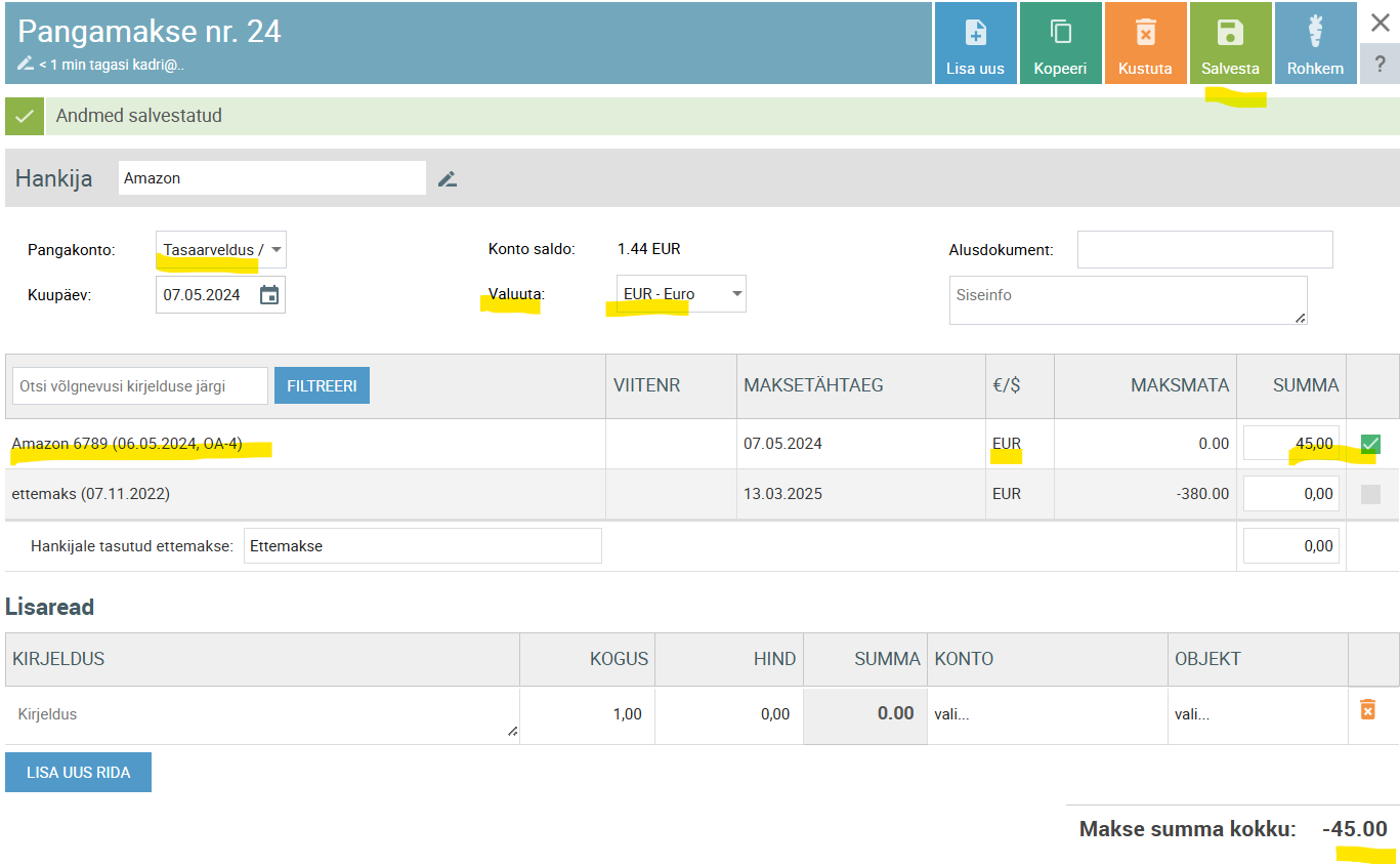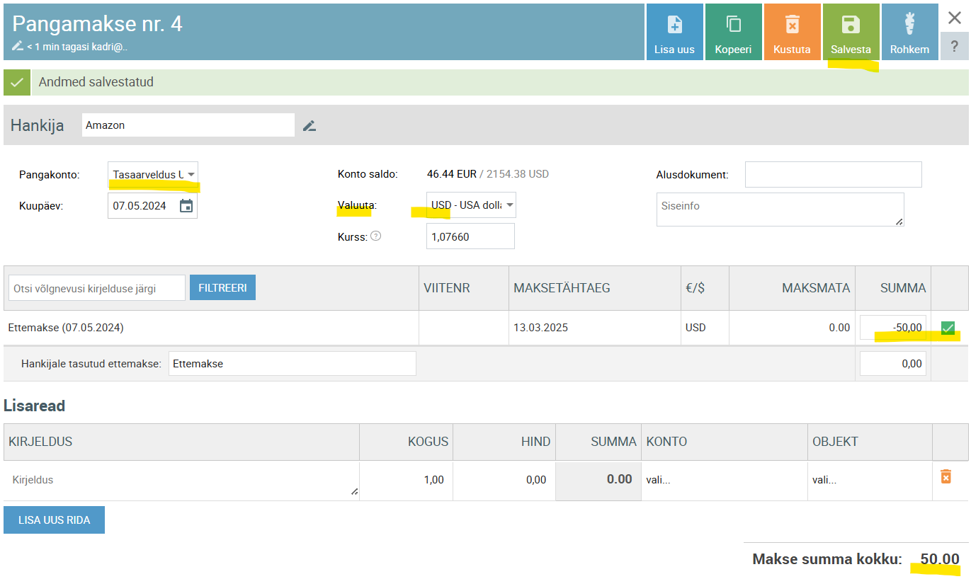 - esimese pangamaksega valida pangaarveks tasaarvelduskonto, valida sobiv hankija ja linnutada eur-s tehtud ettemaks