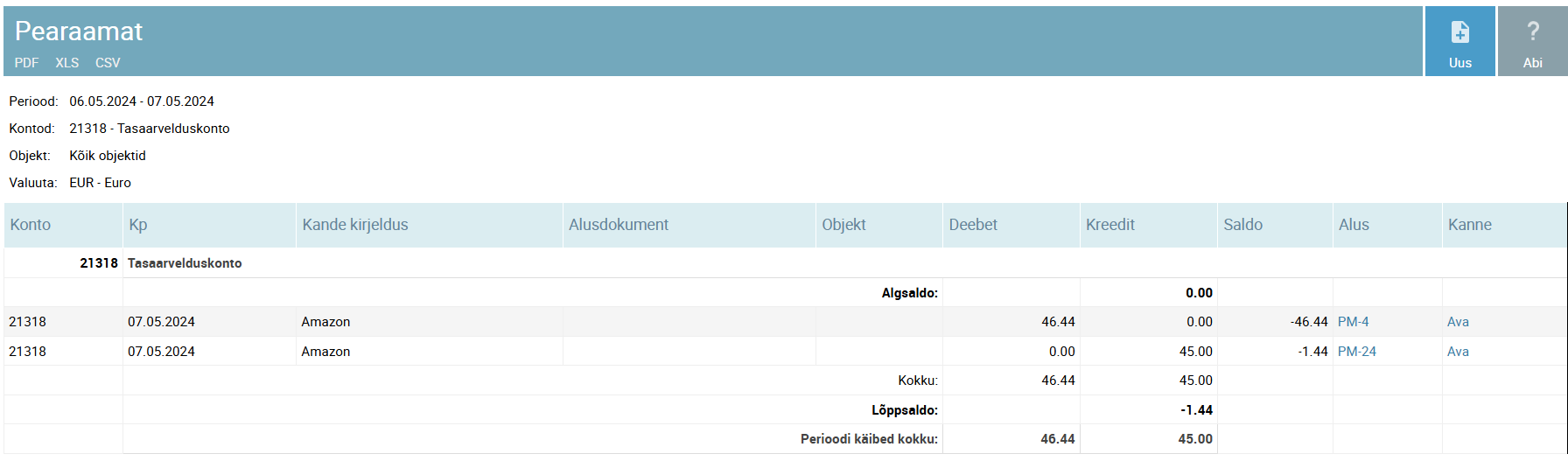 - Kontrollime uuesti Pearaamatu konto saldo üle. Näeme, et lõppsaldo on kenasti 0.00.