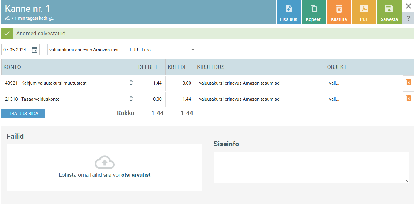 - Enne, kui saad makse salvestada, tuleb maksesse märkida ka eurodes pangakontolt maha läinud summa.