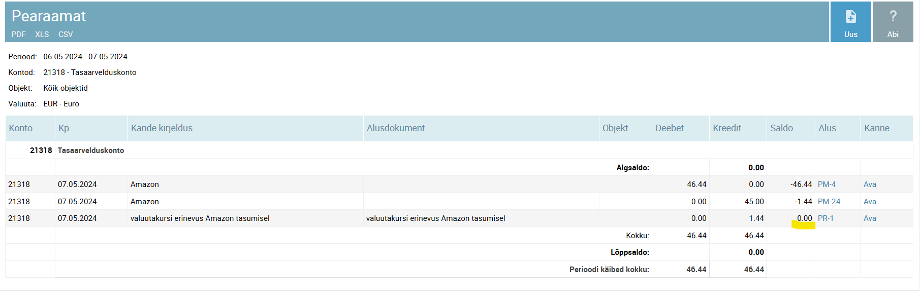 - Kuna peale tasaarveldamist peab Tasaarvelduskonto saldo eurodes jääma 0.00, siis kontrollime Pearaamatus saldo üle. Meie näite puhul on jäänud kontole saldo: