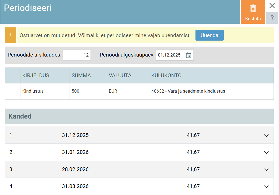 Kui periodiseeritud arvel andmed muutuvad, siis tuleb uuendada ka periodiseerimine. Selleks tuleb avada periodiseerimine (ostuarvel seotud dokumentide jaotises klikata periodiseerimisel) ning vajutada ‘Uuenda’ nuppu ning salvestada.